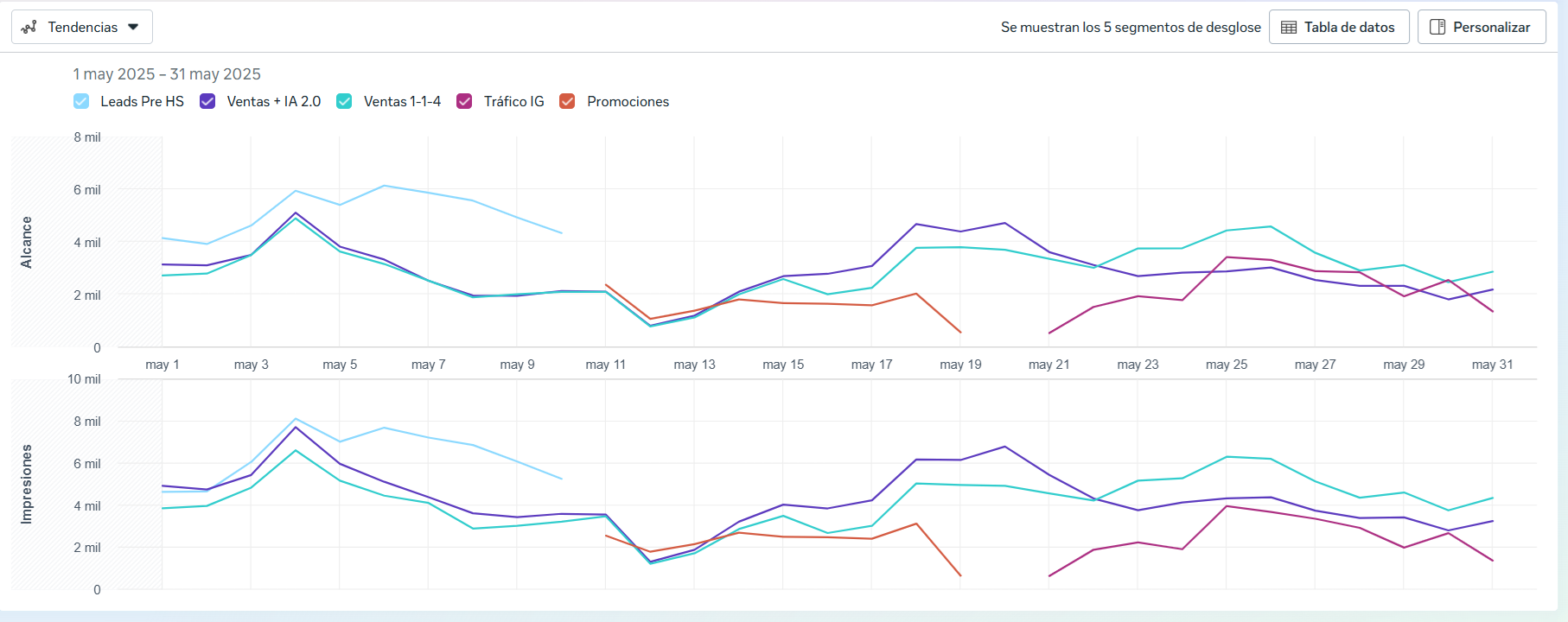 El comportamiento de las campañas muestra un pico de alcance e impresiones entre el 3 y el 6 de mayo, correspondiente a la etapa de captación de leads del Pre Hot Sale.
