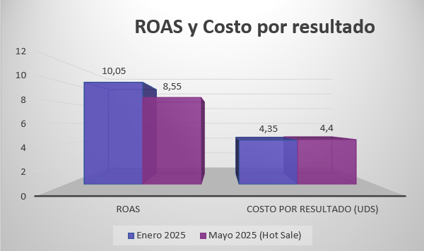 El ROAS promedio fue de 8,55, con un costo por resultado estable de USD 4,4, lo que demuestra eficiencia en la inversión publicitaria y una mejora en la calidad de las audiencias alcanzadas.