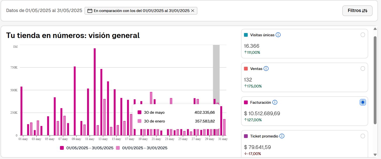Al comparar enero con mayo, se destaca un incremento significativo en ticket promedio (+21%), acompañado por un aumento del 44% en el volumen de ventas durante el Hot Sale.